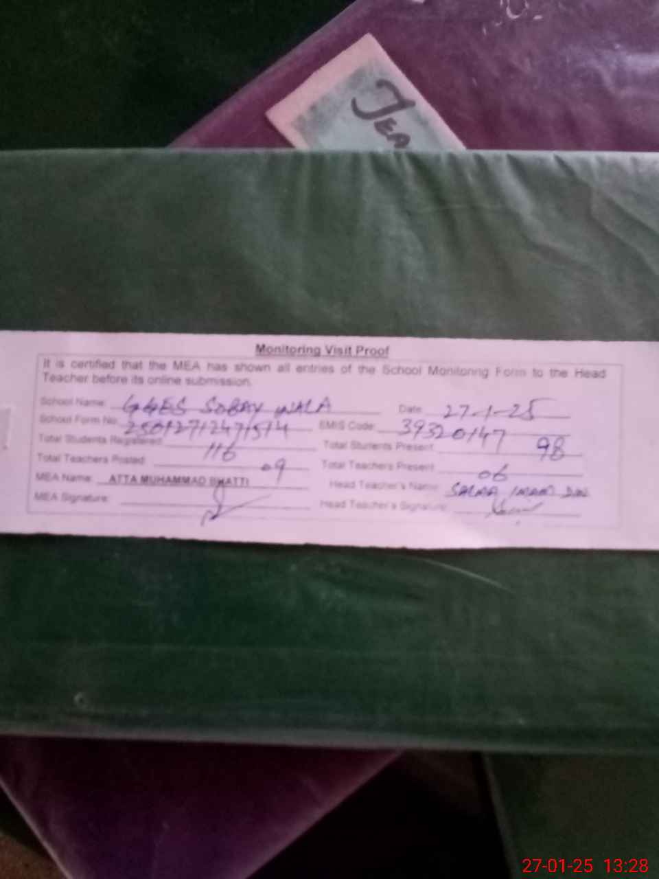 | Attendance Register | Head Teacher | MEA with School | Visit Proof |