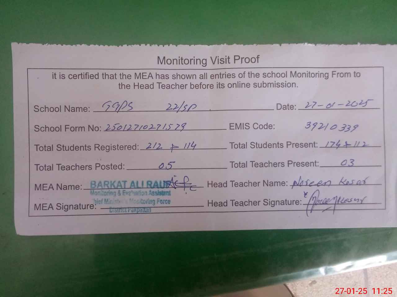 | Attendance Register | Head Teacher | MEA with School | Visit Proof |