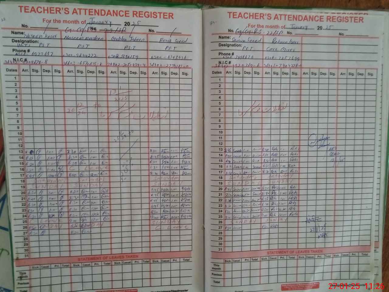 | CNIC | Full Name | Designation | R/C | Absence During Last Calender Month |