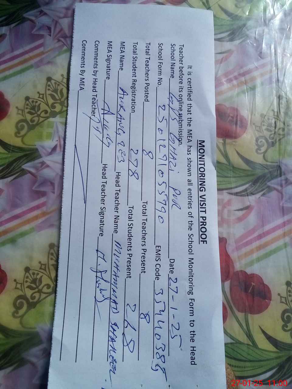 | Attendance Register | Head Teacher | MEA with School | Visit Proof |