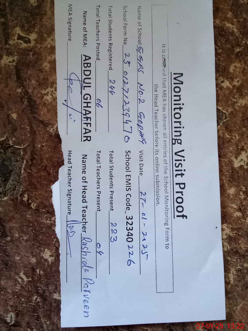 | Attendance Register | Head Teacher | MEA with School | Visit Proof |