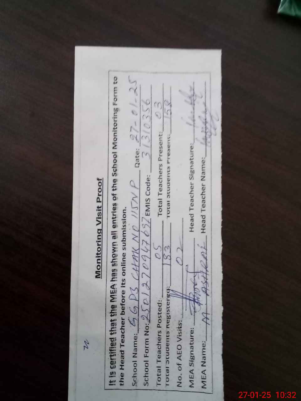 | Attendance Register | Head Teacher | MEA with School | Visit Proof |