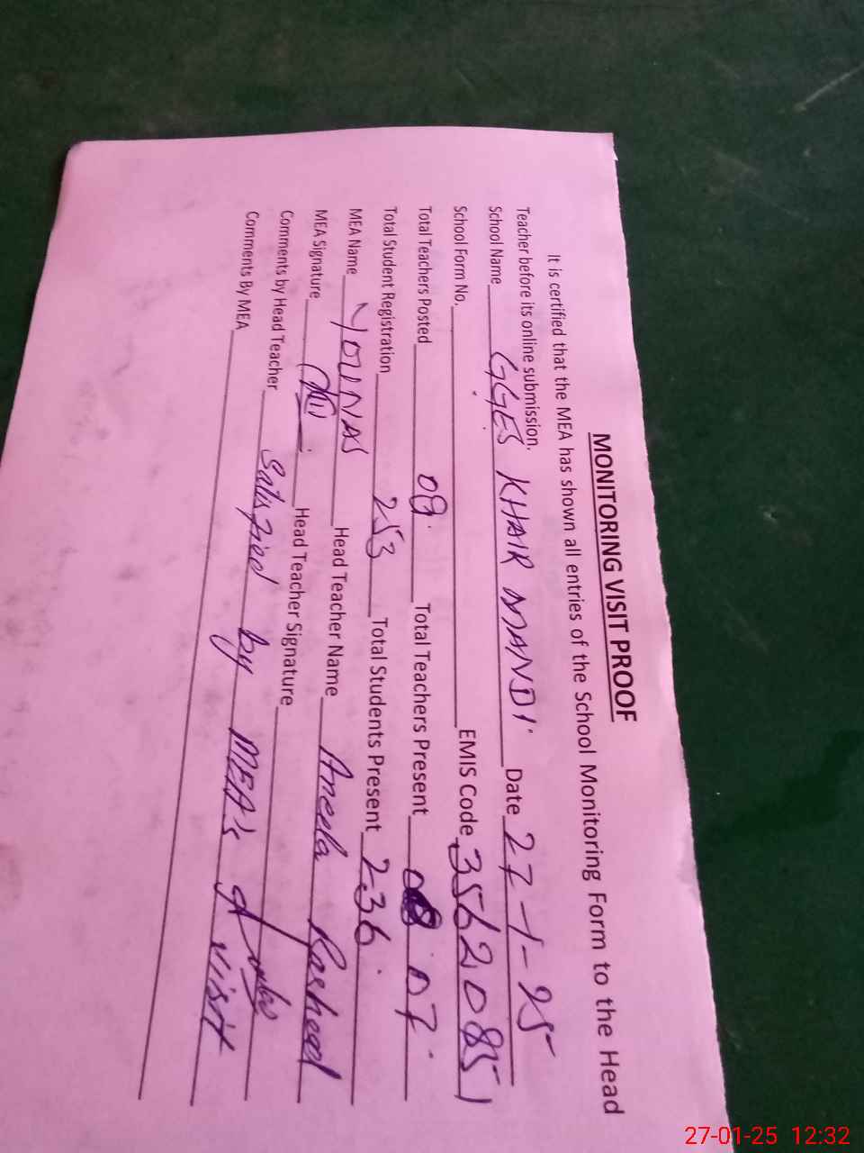 | Attendance Register | Head Teacher | MEA with School | Visit Proof |