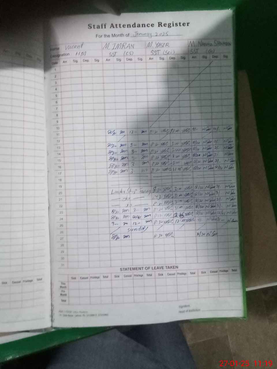 | CNIC | Full Name | Designation | R/C | Absence During Last Calender Month |