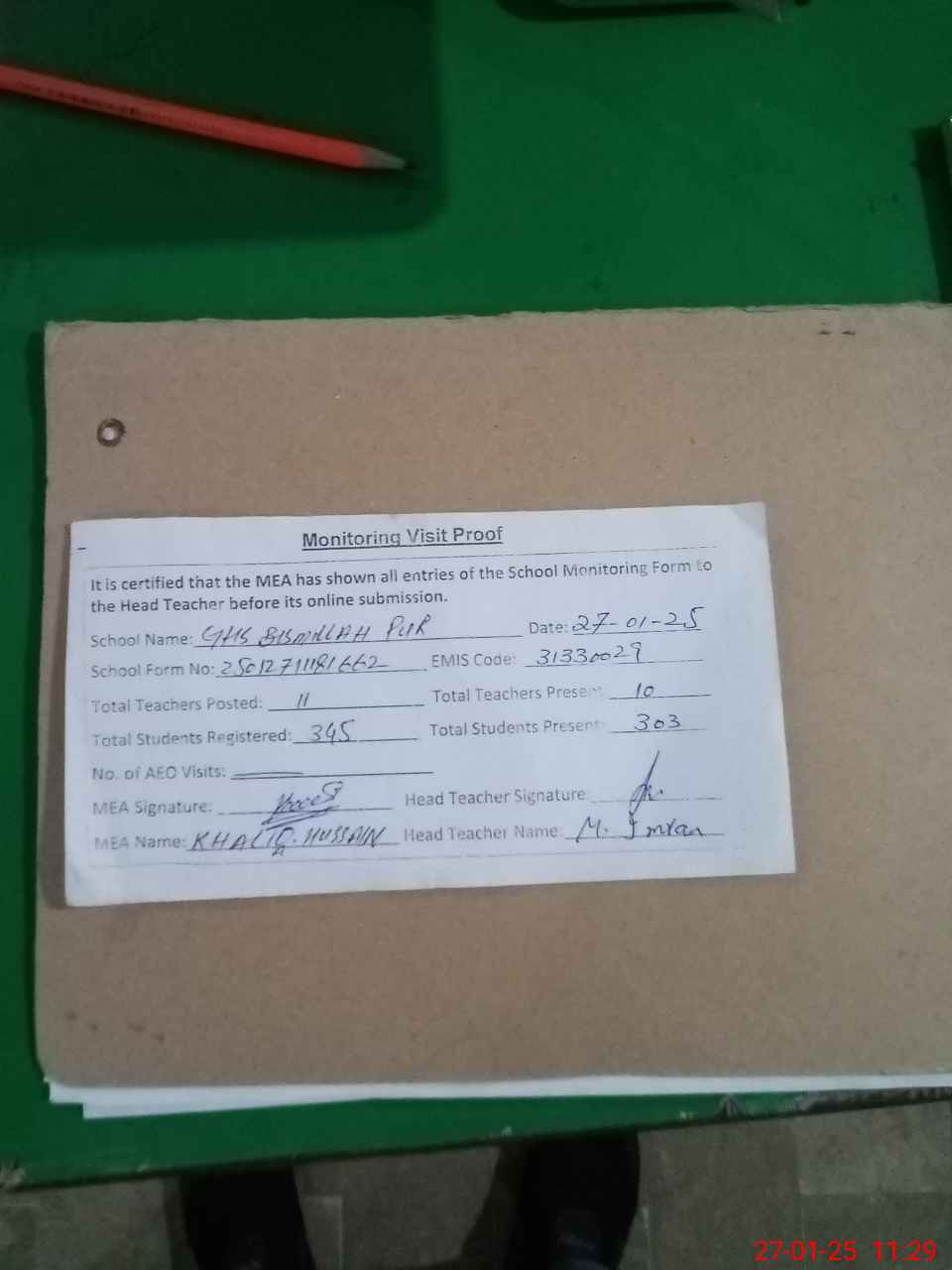| Attendance Register | Head Teacher | MEA with School | Visit Proof |