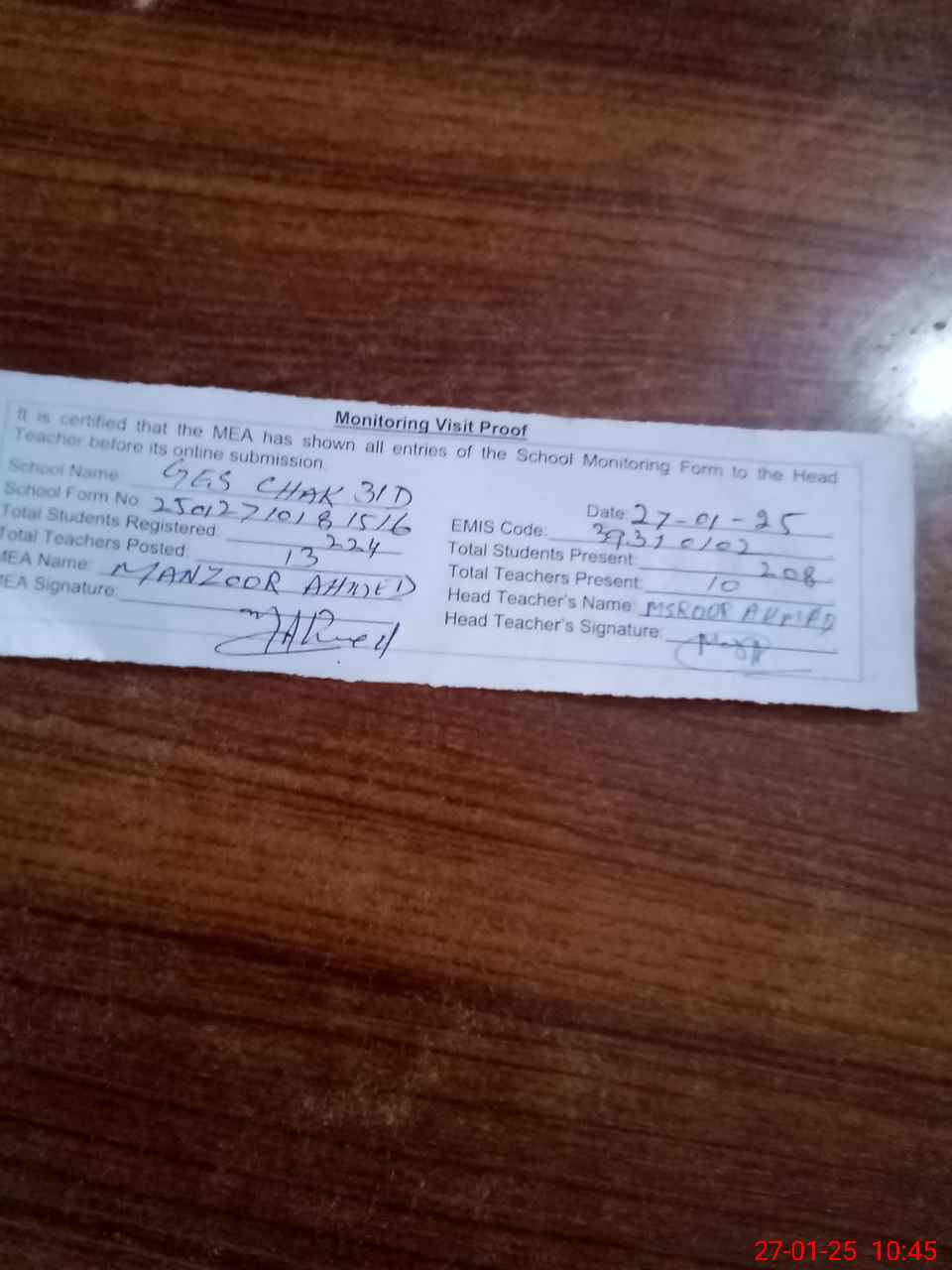 | Attendance Register | Head Teacher | MEA with School | Visit Proof |