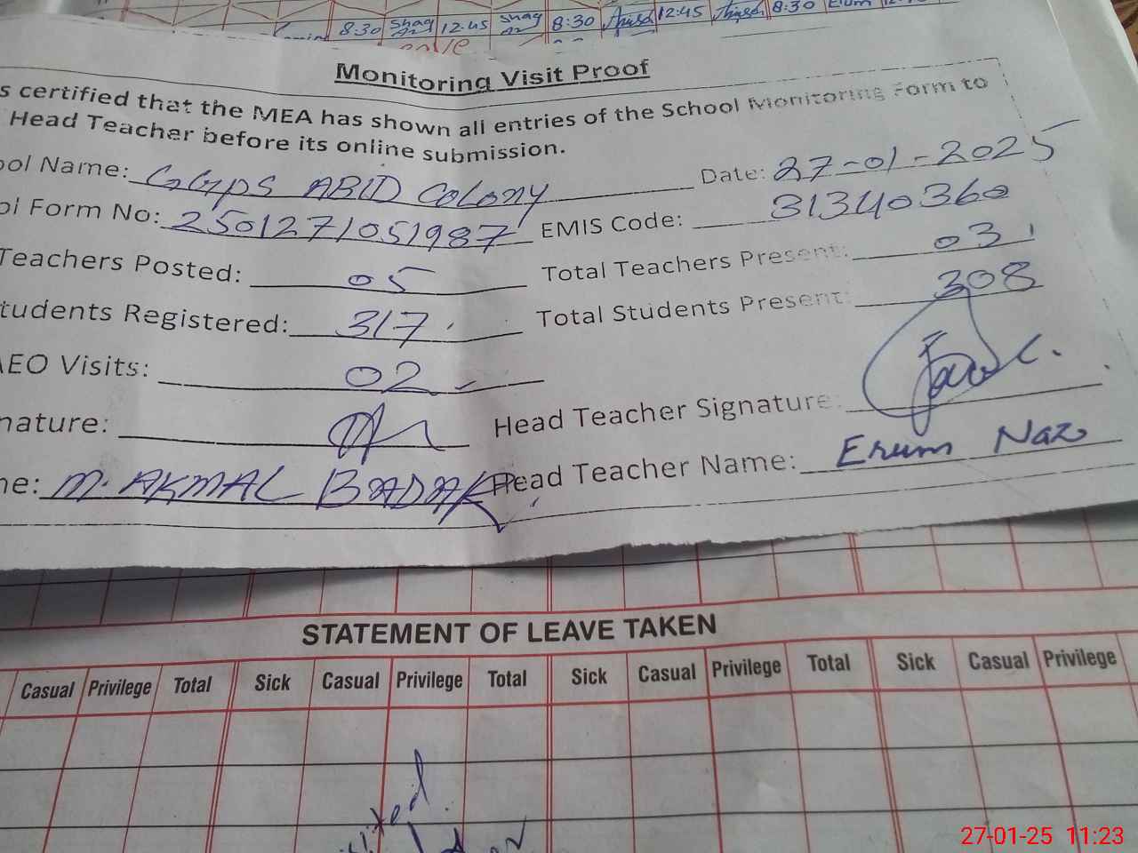 | Attendance Register | Head Teacher | MEA with School | Visit Proof |