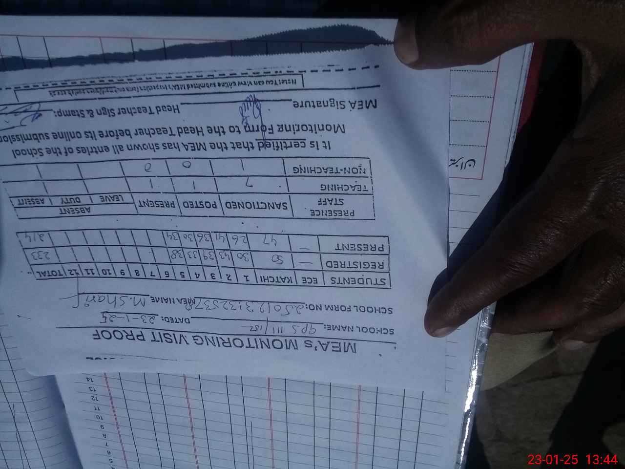 | Attendance Register | Head Teacher | MEA with School | Visit Proof |