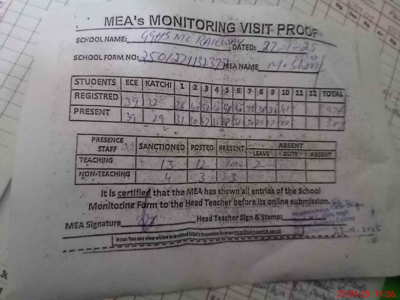 | EMIS Code: 36430076 | Name of School: GGHS MC RAILWAY COLONY, MIAN CHANNU | |||