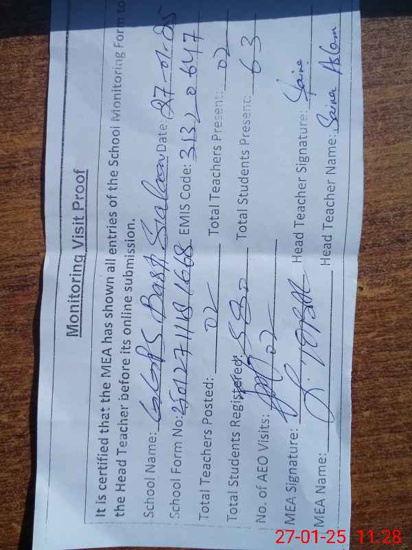 | Attendance Register | Head Teacher | MEA with School | Visit Proof |