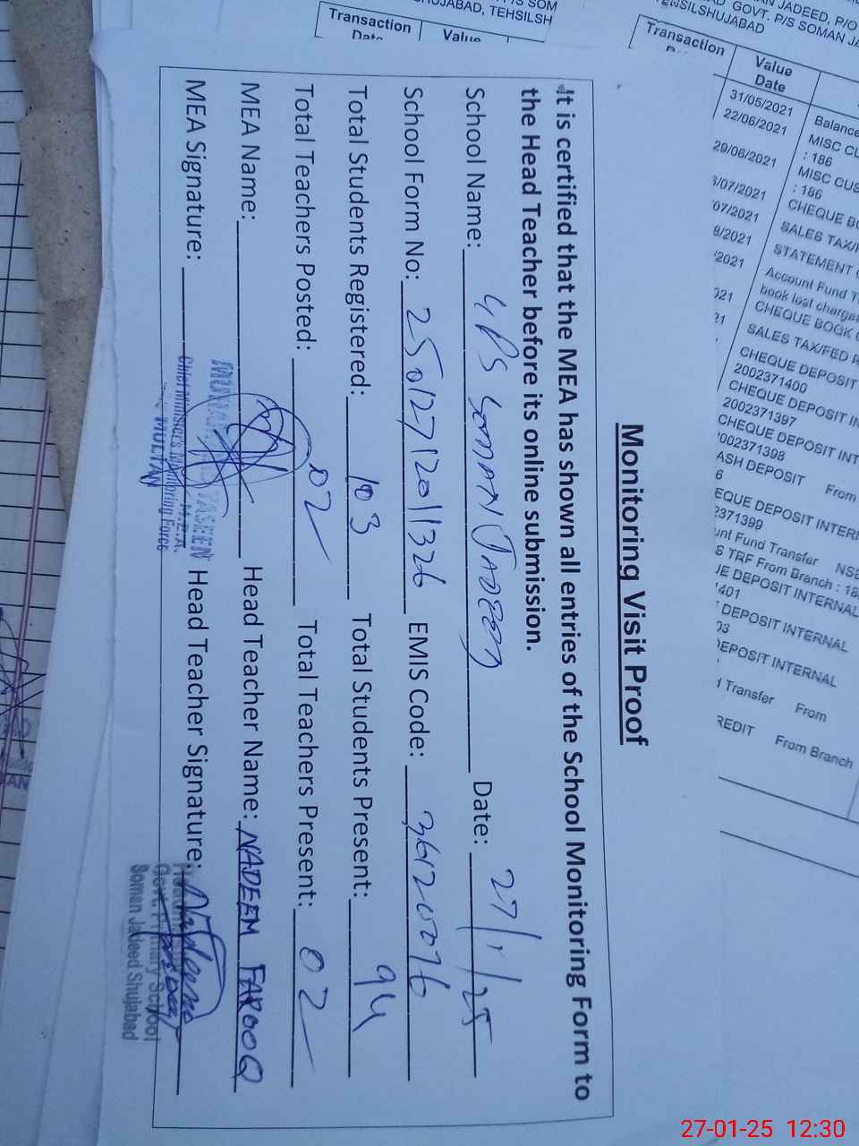 | EMIS Code: 36120076 | Name of School: GPS SOMAN JADEED P/O AGAR KHANI MOZA SOMAN | |||