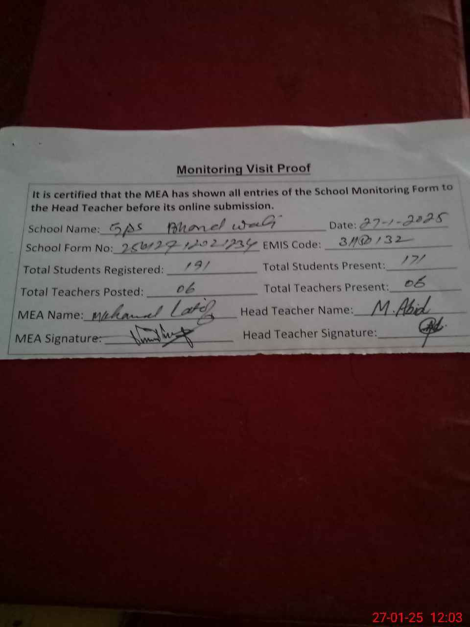 | Attendance Register | Head Teacher | MEA with School | Visit Proof |