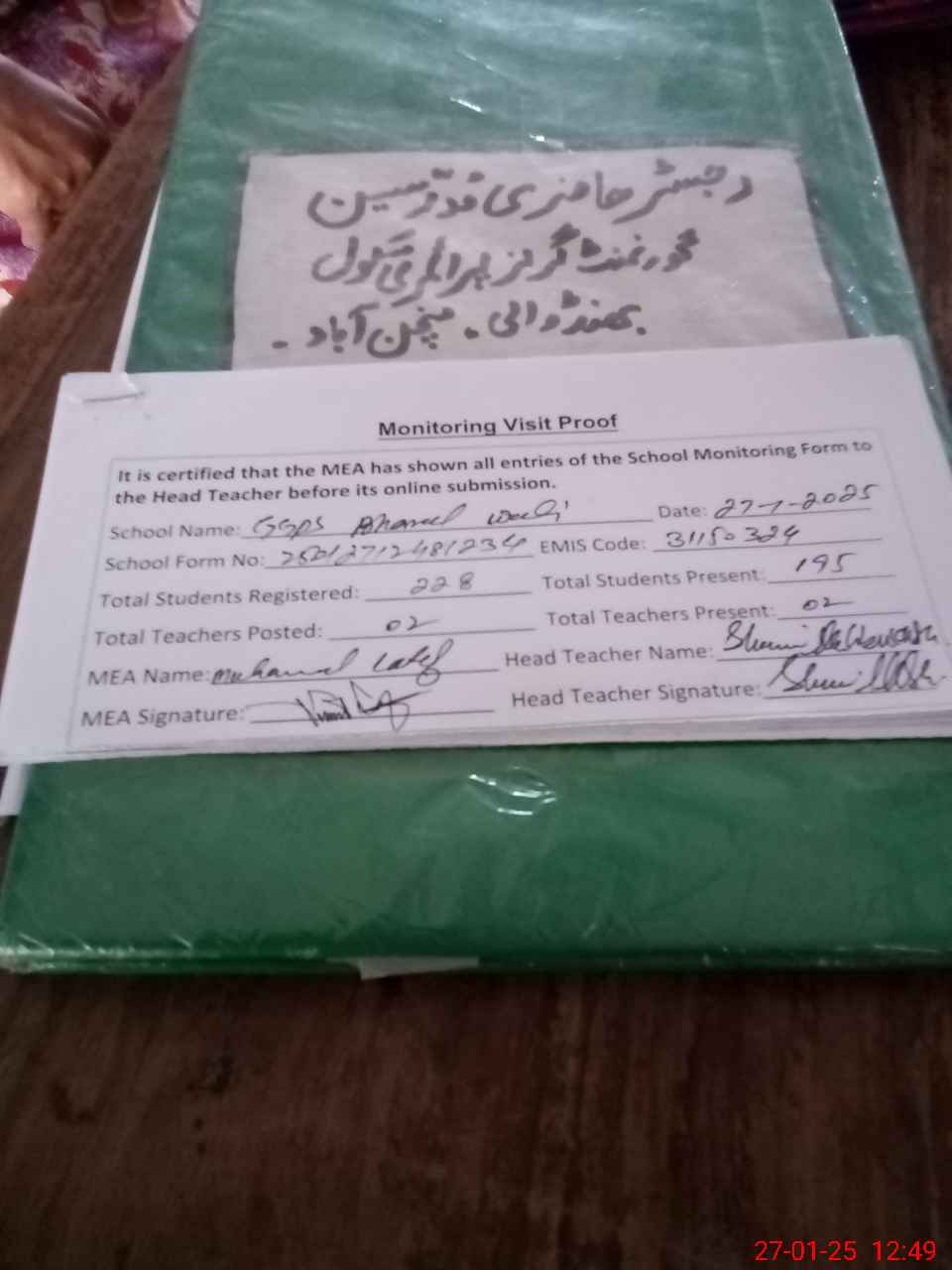 | Attendance Register | Head Teacher | MEA with School | Visit Proof |