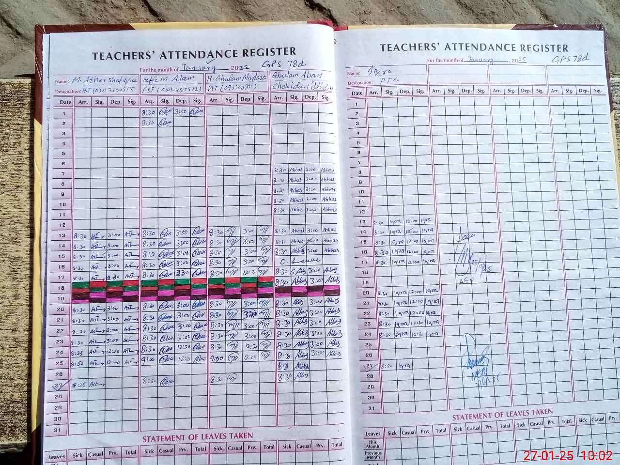 | Remarks (Use Separate Page if Required): Chokidar Ghulsm abass additional duty from GGES 79 Present in this school Books record not showing | |||||