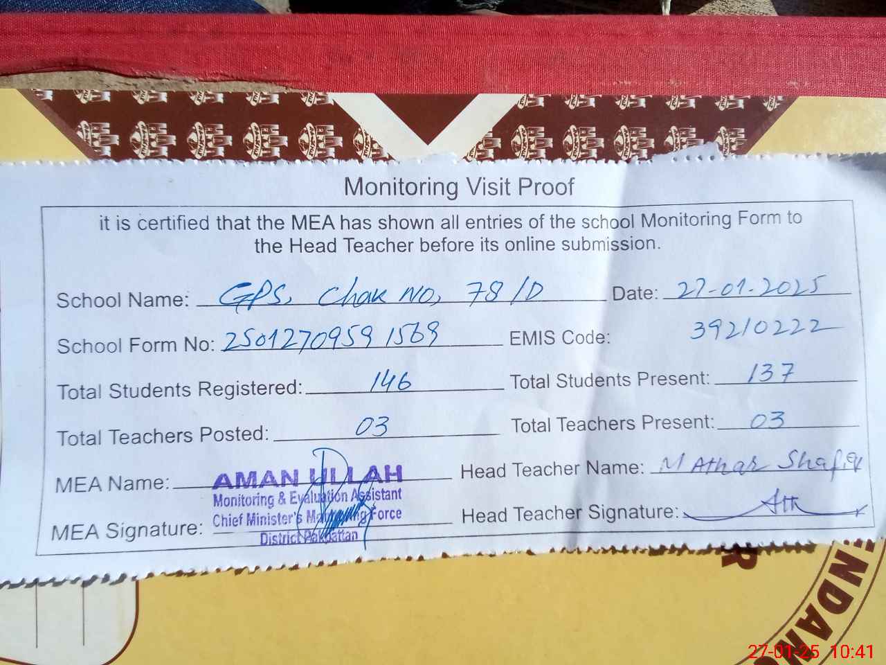 | Attendance Register | Head Teacher | MEA with School | Visit Proof |