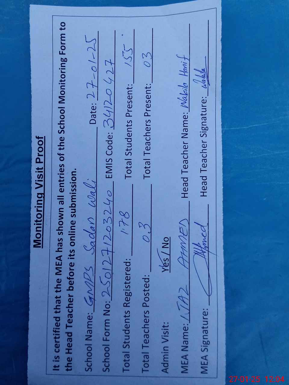| EMIS Code: 34120427 | Name of School: GMPS SADAN WALI | |||