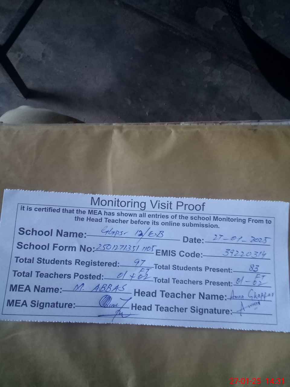 | Attendance Register | Head Teacher | MEA with School | Visit Proof |