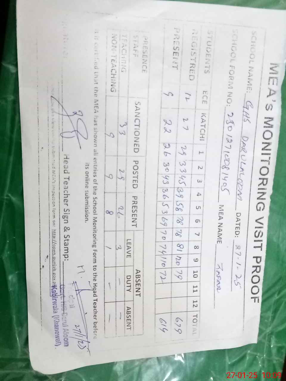 | Monitoring Date: 27-01-2025 | Start Time: 27-01-2025 09:42 AM | End Time: 27-01-2025 10:16 AM | Name of MEA: MU**** ZA**** IQ**** | |