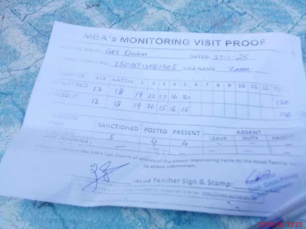 | Attendance Register | Head Teacher | MEA with School | Visit Proof |
