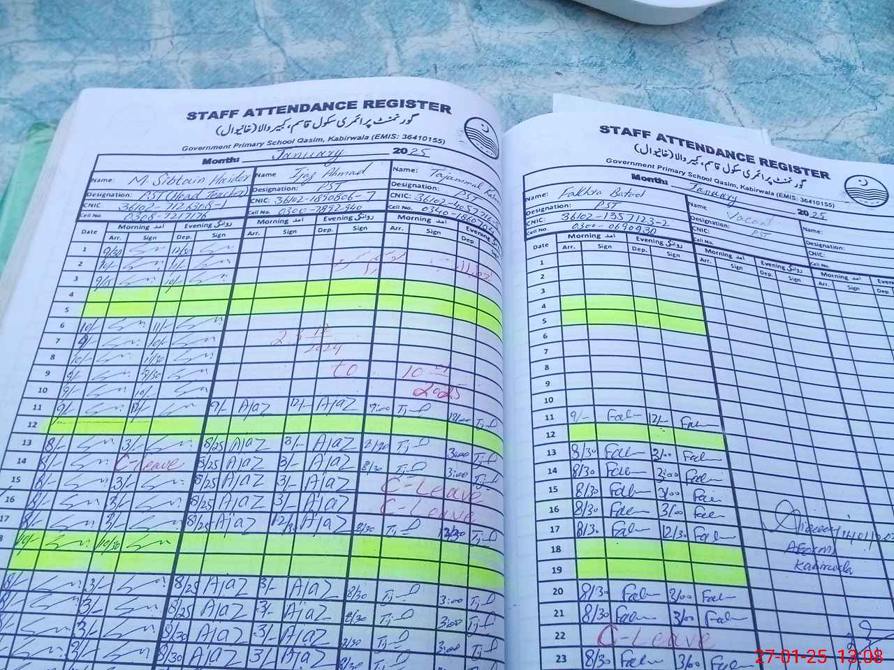 | CNIC | Full Name | Designation | R/C | Absence during last cal. month |