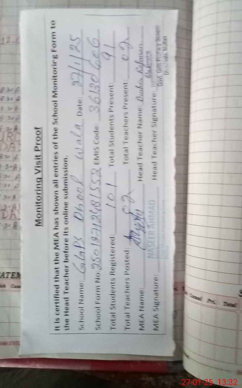 | Attendance Register | Head Teacher | MEA with School | Visit Proof |