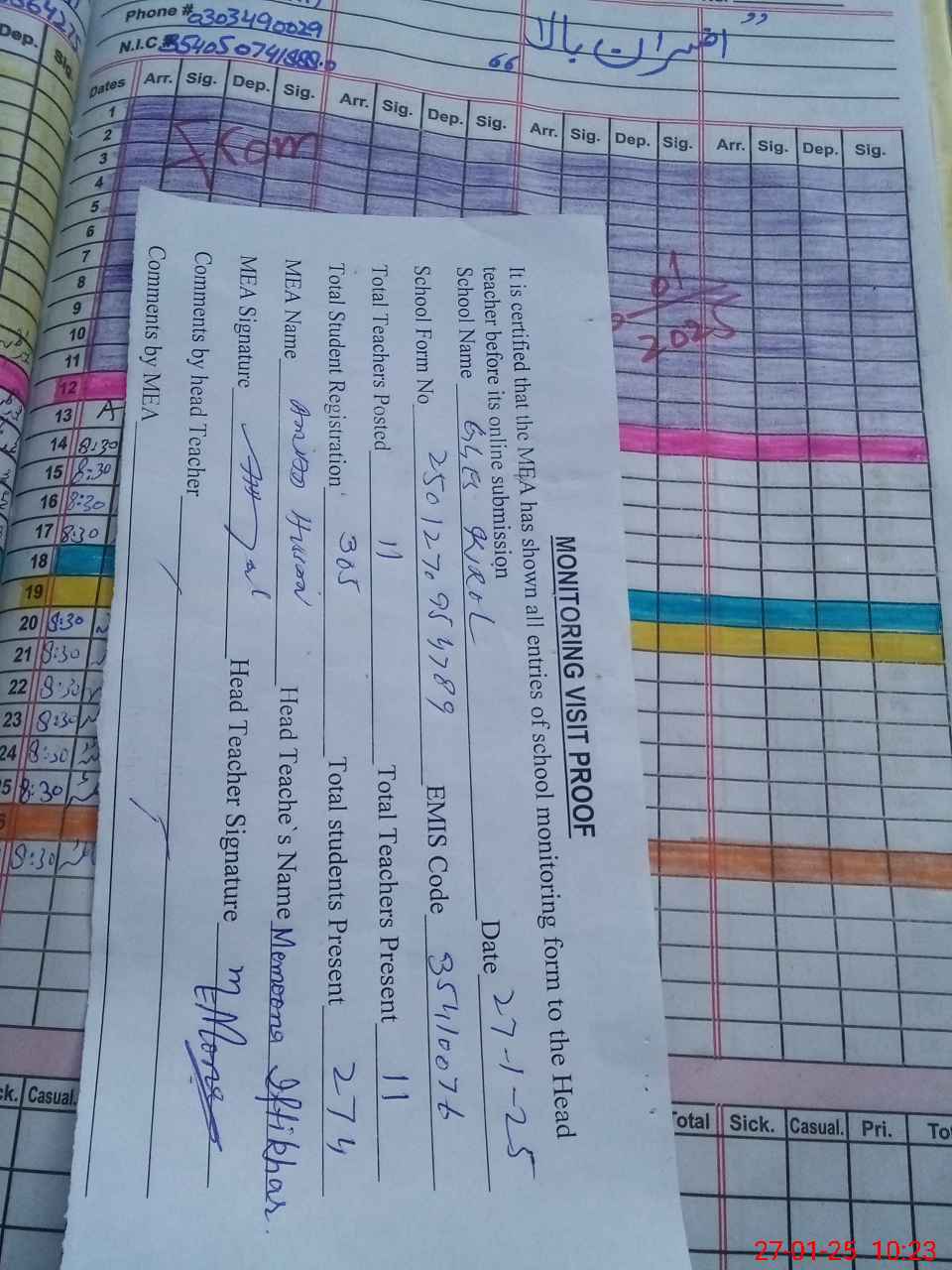 | Attendance Register | Head Teacher | MEA with School | Visit Proof |
