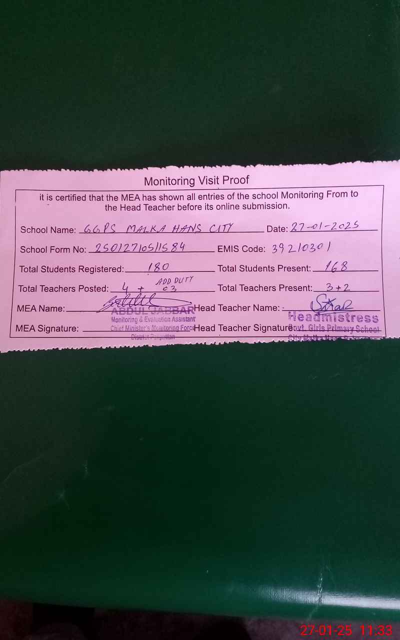 | EMIS Code: 39210301 | Name of School: GGPS MALKA HANS CITY | |||