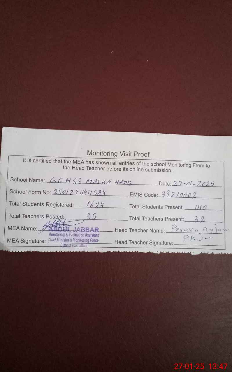 | EMIS Code: 39210002 | Name of School: GGHSS MALKA HANS | |||