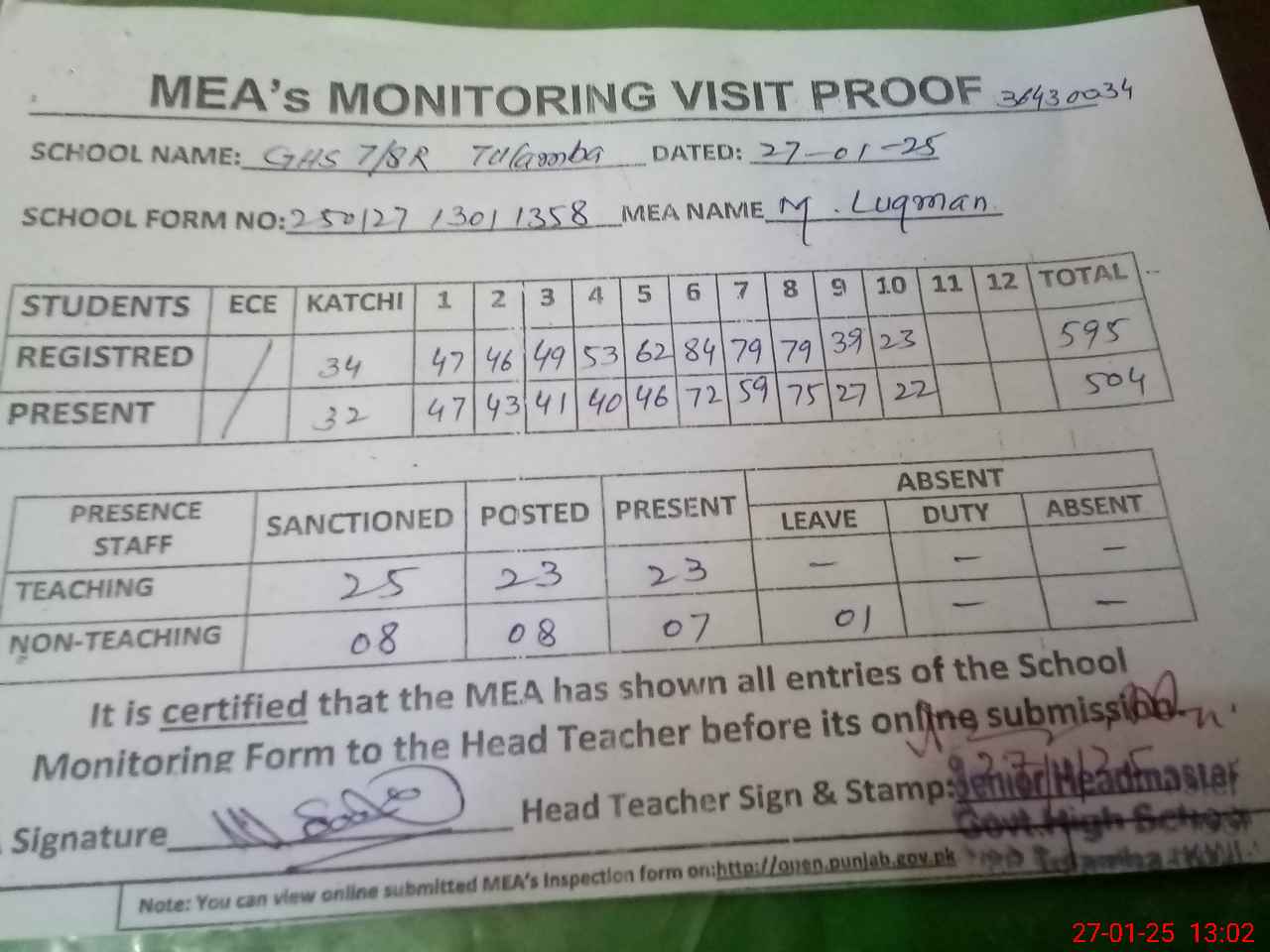 | Attendance Register | Head Teacher | MEA with School | Visit Proof |