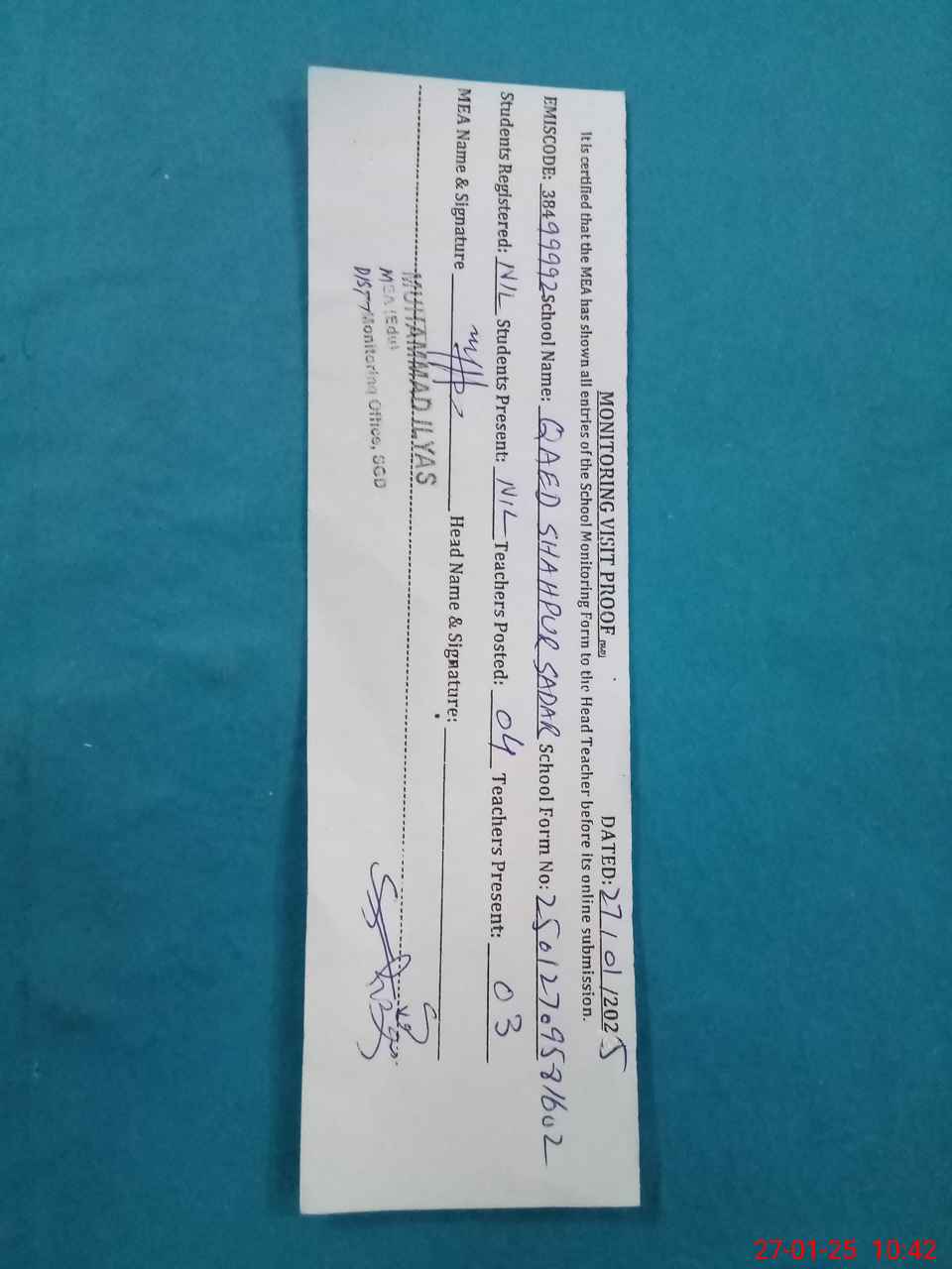 | Attendance Register | Head Teacher | MEA with School | Visit Proof |
