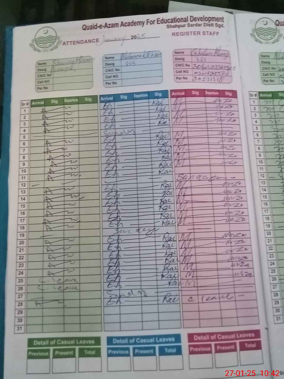 | CNIC | Full Name | Designation | R/C | Absence during last cal. month |