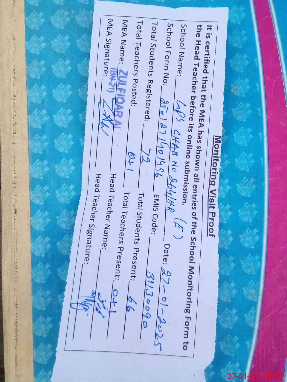 | Attendance Register | Head Teacher | MEA with School | Visit Proof |