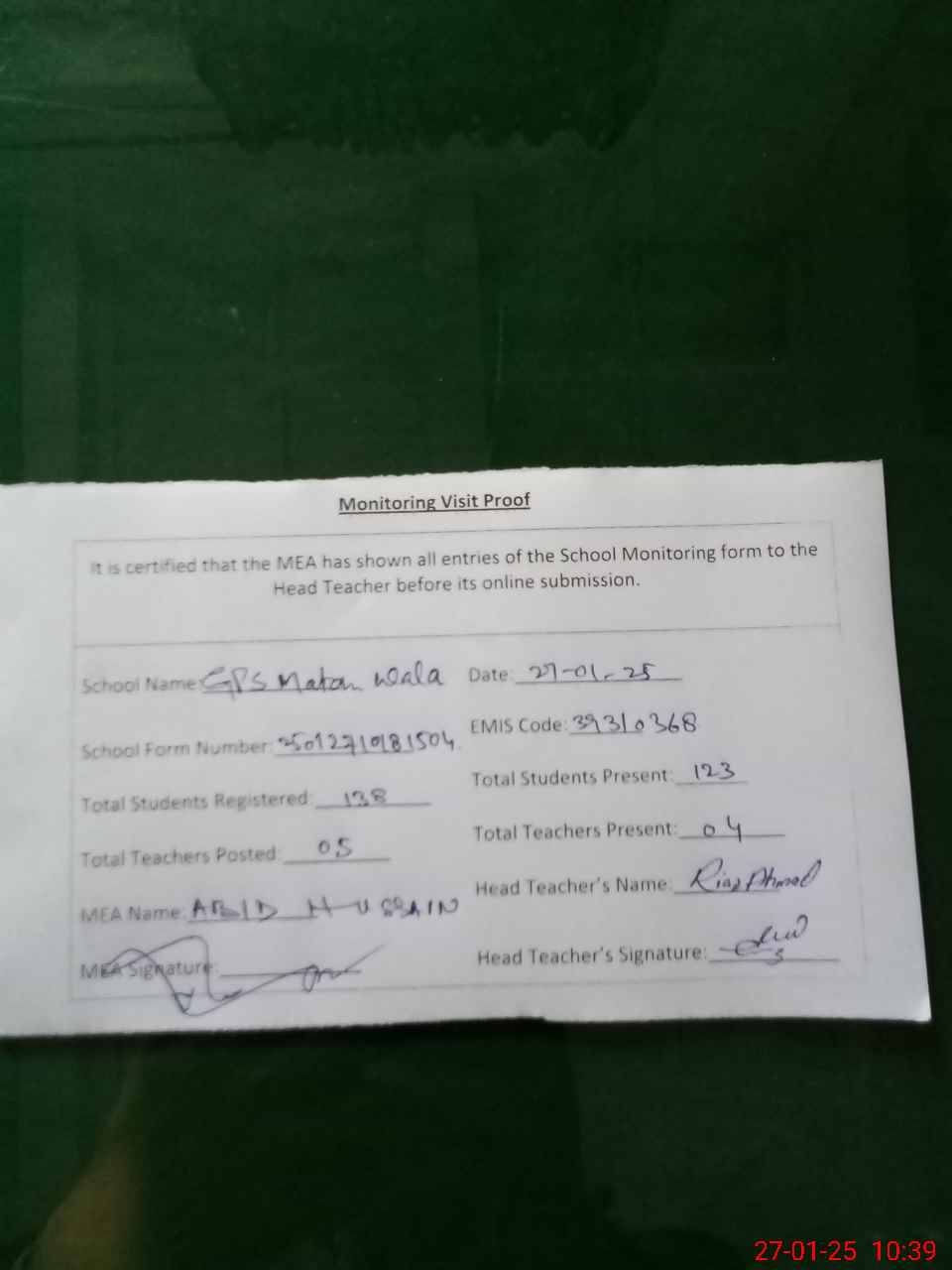 | Attendance Register | Head Teacher | MEA with School | Visit Proof |
