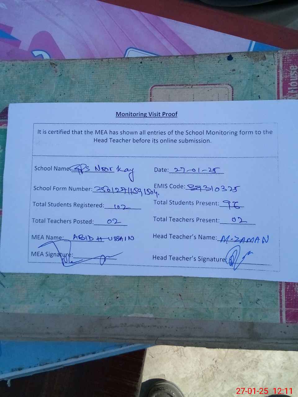 | EMIS Code: 39310325 | Name of School: GPS NOOR KAY | |||