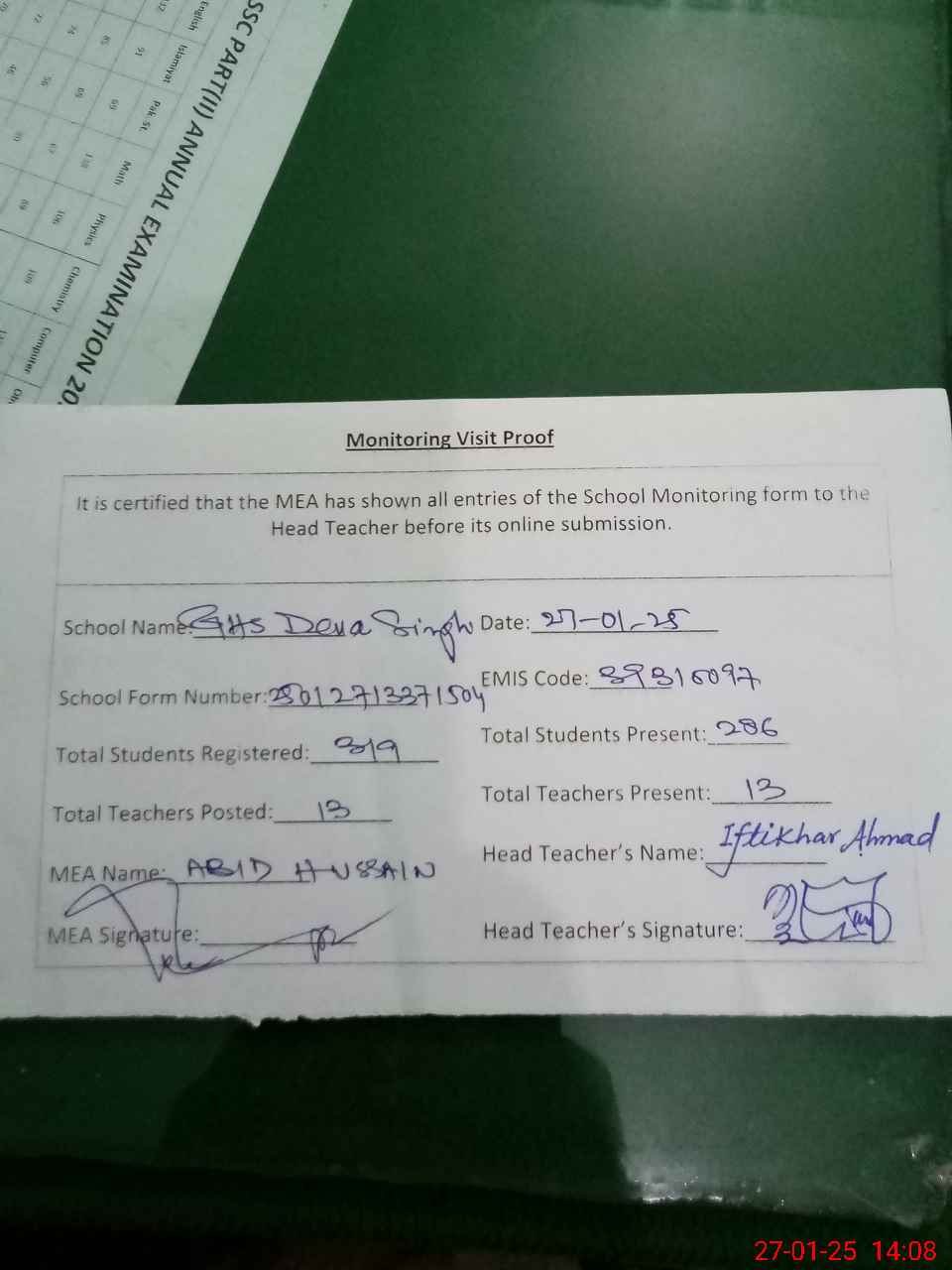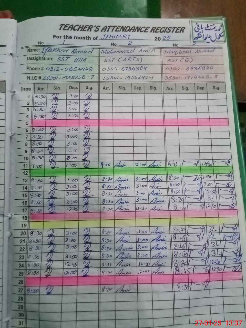 | Name: IF**** AH**** Designation: (School Headmaster's/Headmistress's) SST INCHARGE HM Phone/Cell Number: 03**** |