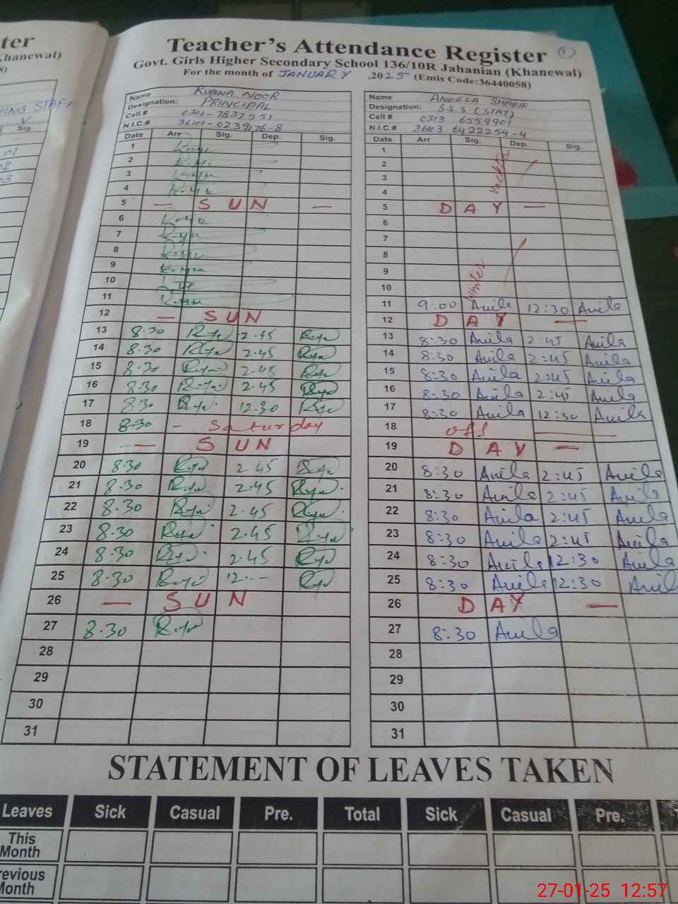 | CNIC | Full Name | Designation | R/C | Absence During Last Calender Month |