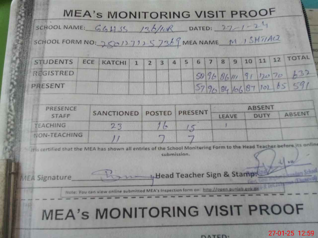 | Attendance Register | Head Teacher | MEA with School | Visit Proof |