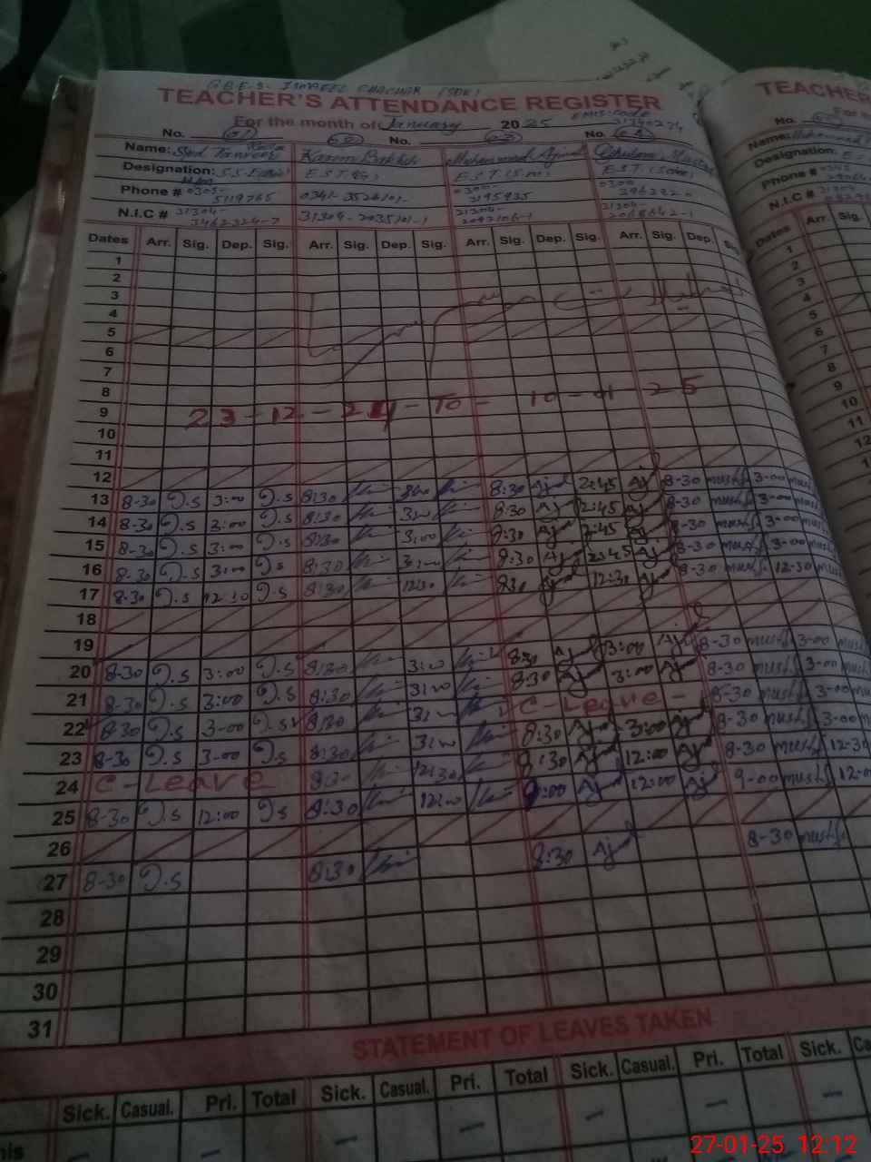 | CNIC | Full Name | Designation | R/C | Absence During Last Calender Month |
