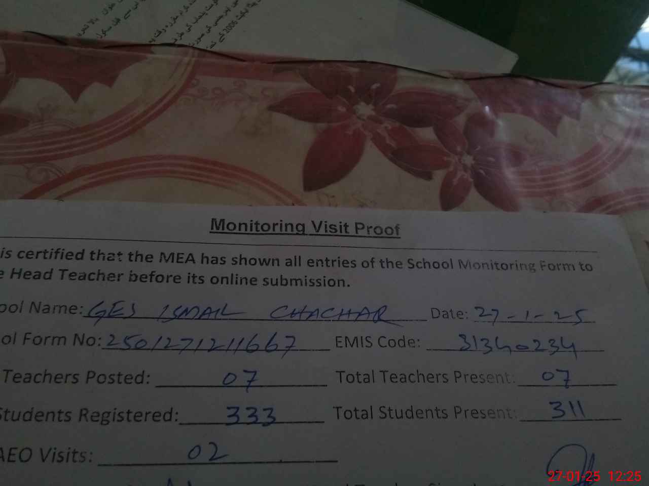 | Attendance Register | Head Teacher | MEA with School | Visit Proof |