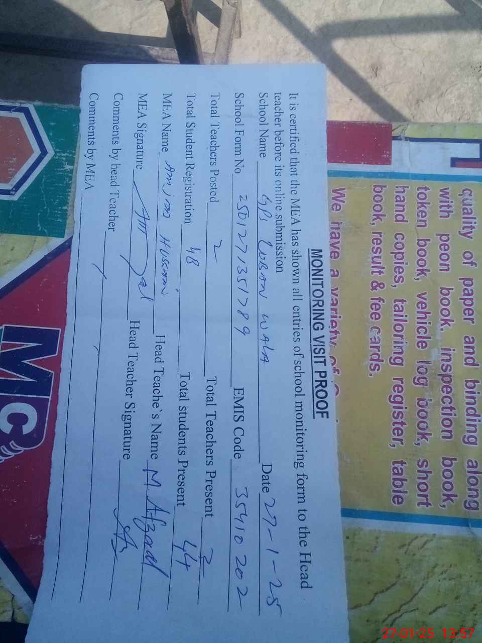 | Attendance Register | Head Teacher | MEA with School | Visit Proof |