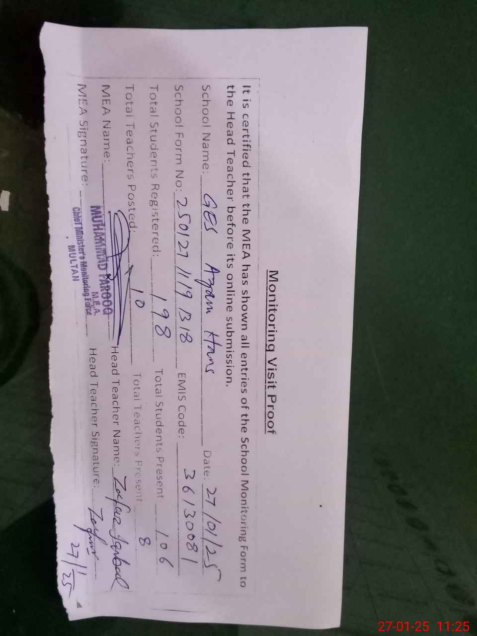 | Attendance Register | Head Teacher | MEA with School | Visit Proof |