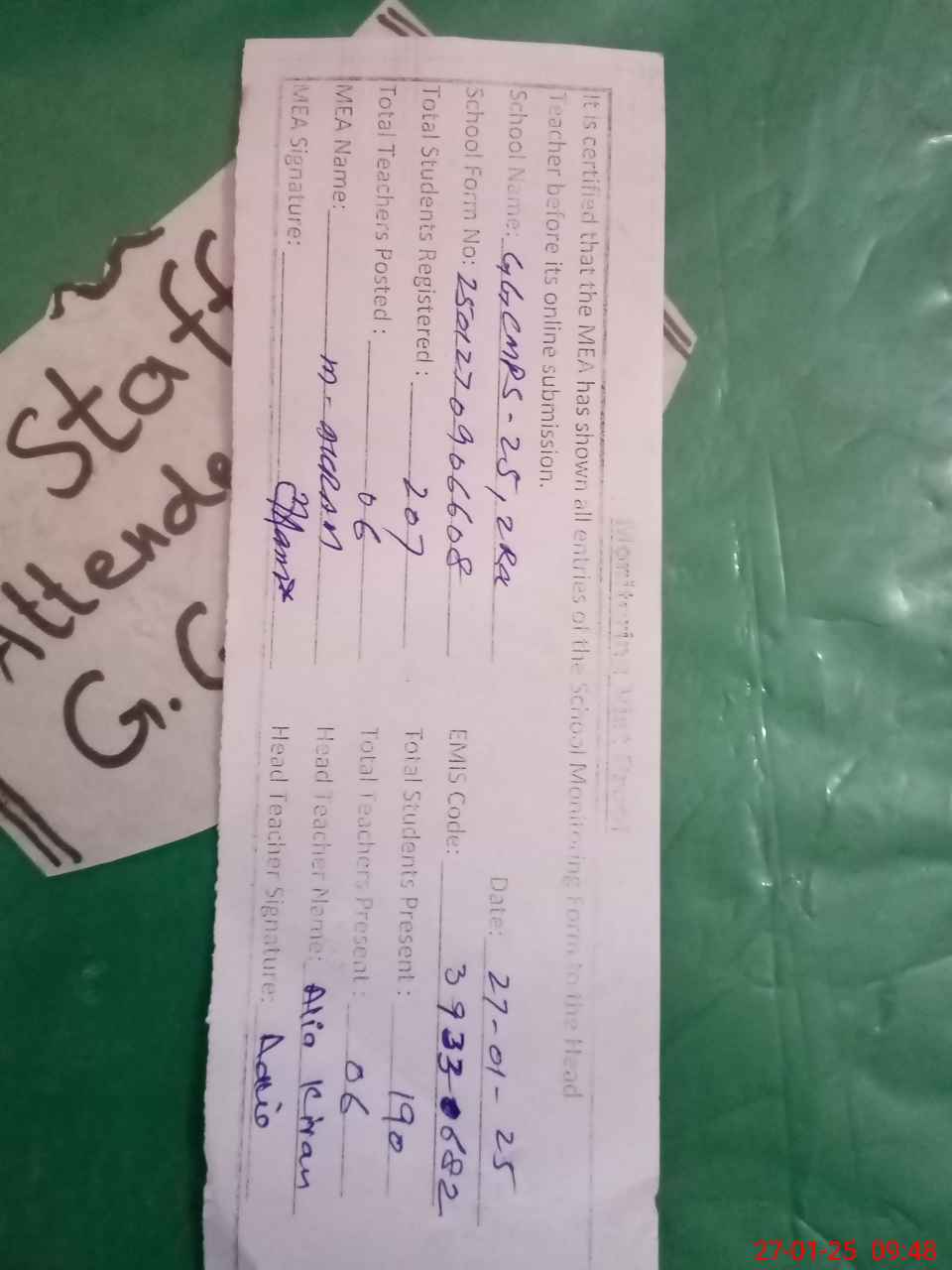 | Attendance Register | Head Teacher | MEA with School | Visit Proof |