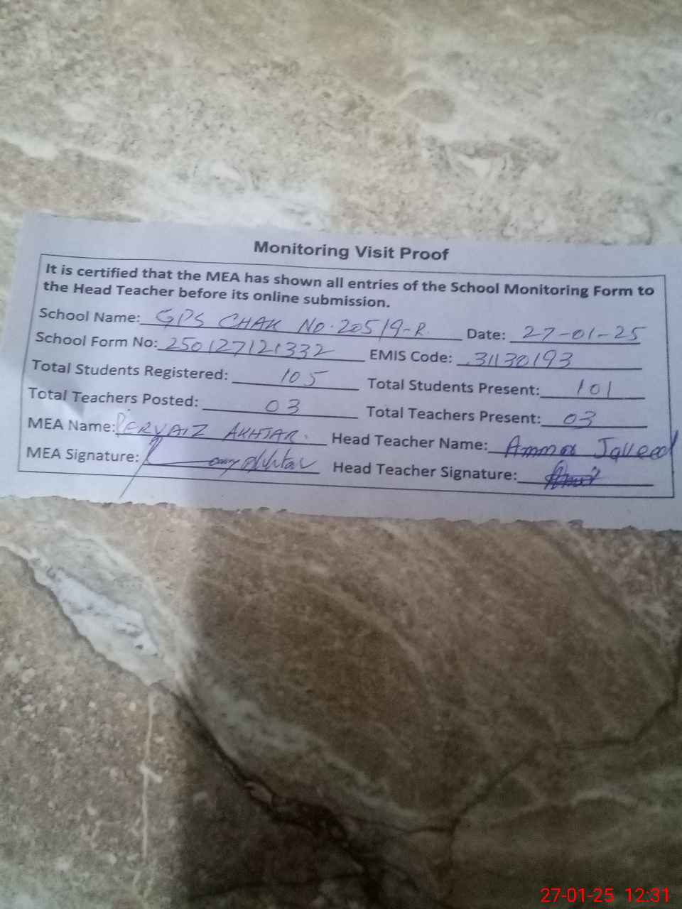 | EMIS Code: 31130193 | Name of School: GPS CHAK NO.205/9-R | |||