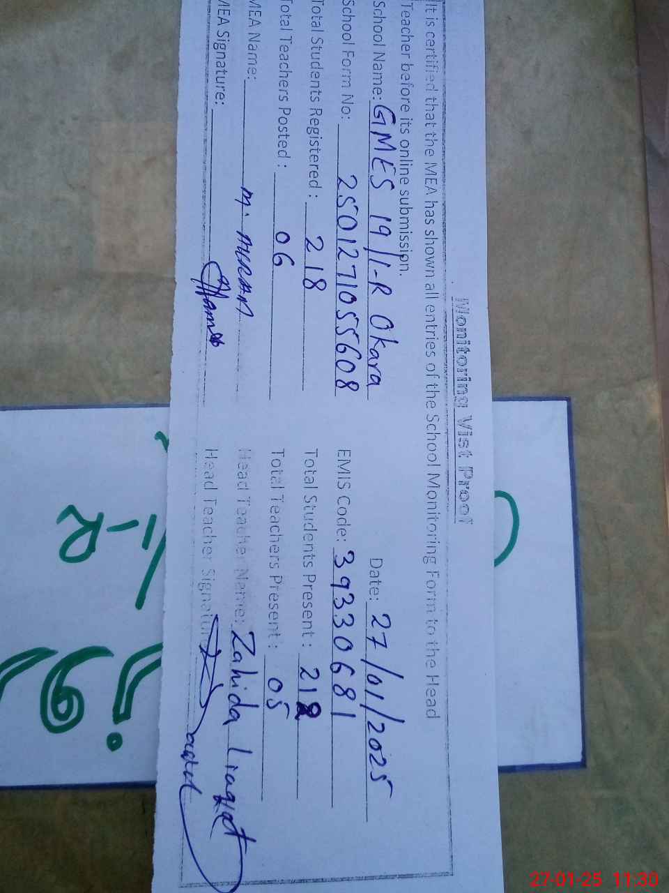 | Attendance Register | Head Teacher | MEA with School | Visit Proof |