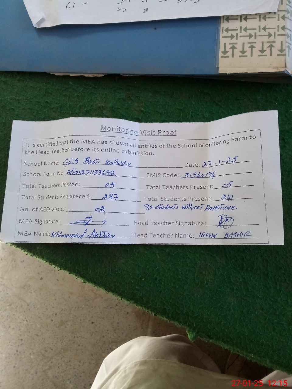 | Attendance Register | Head Teacher | MEA with School | Visit Proof |
