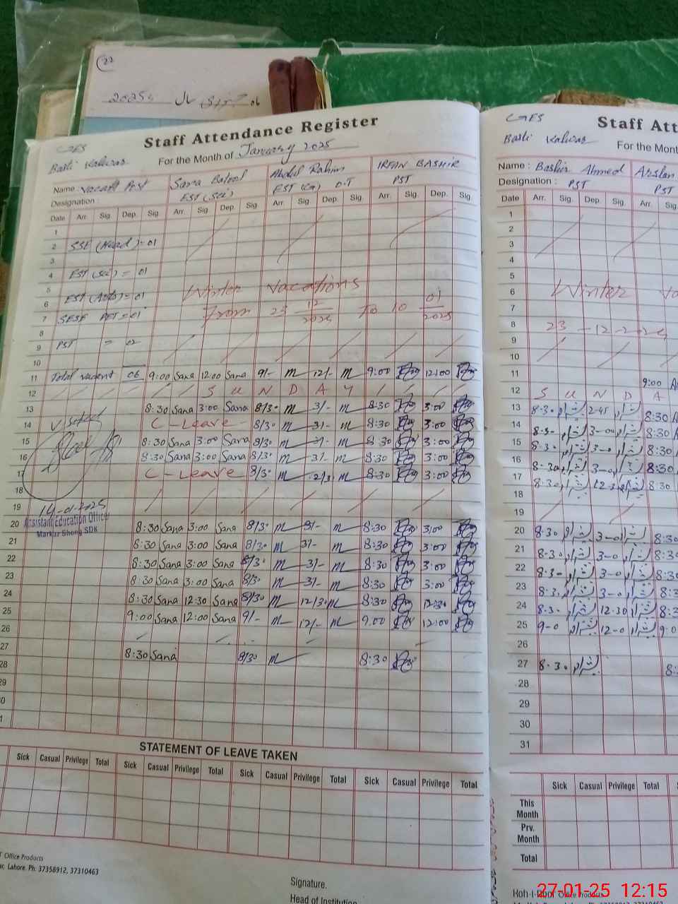 | CNIC | Full Name | Designation | R/C | Absence During Last Calender Month |