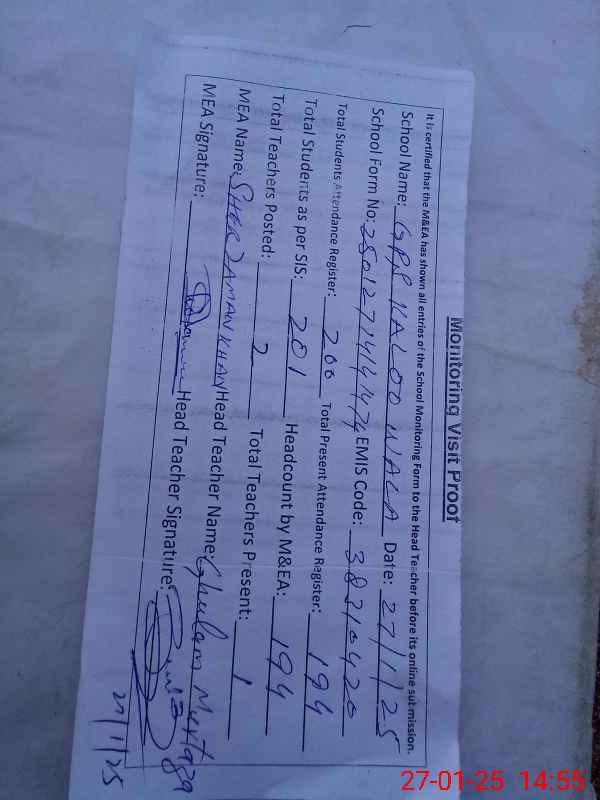 | Attendance Register | Head Teacher | MEA with School | Visit Proof |