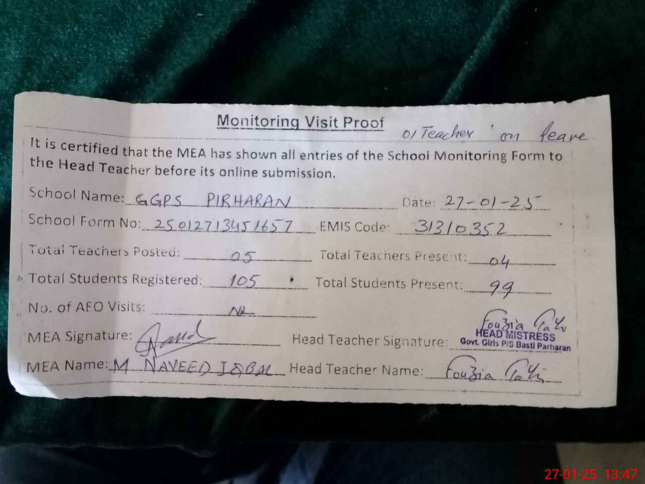| Attendance Register | Head Teacher | MEA with School | Visit Proof |