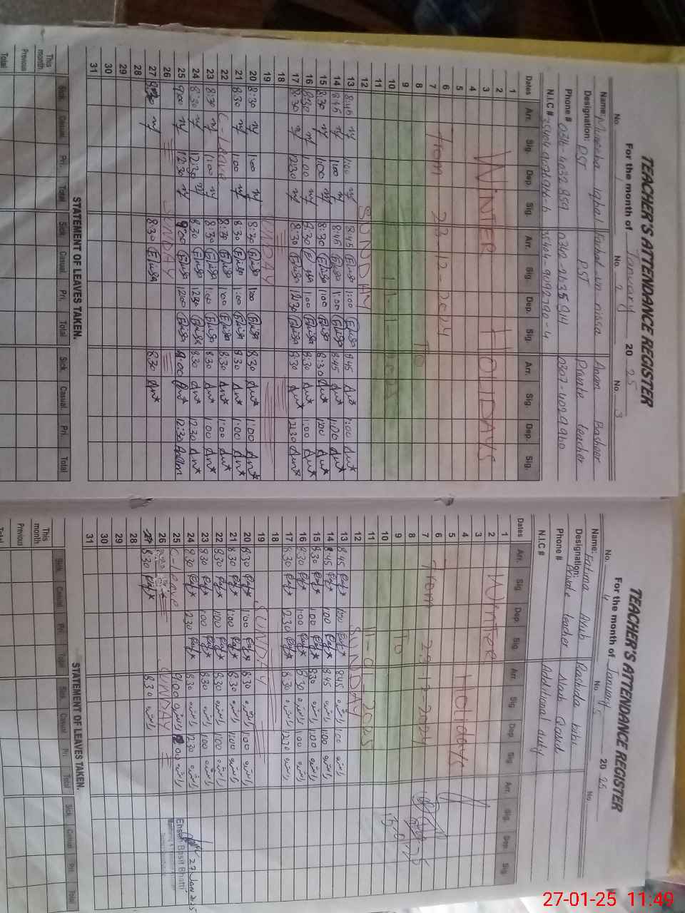 | CNIC | Full Name | Designation | R/C | Absence During Last Calender Month |