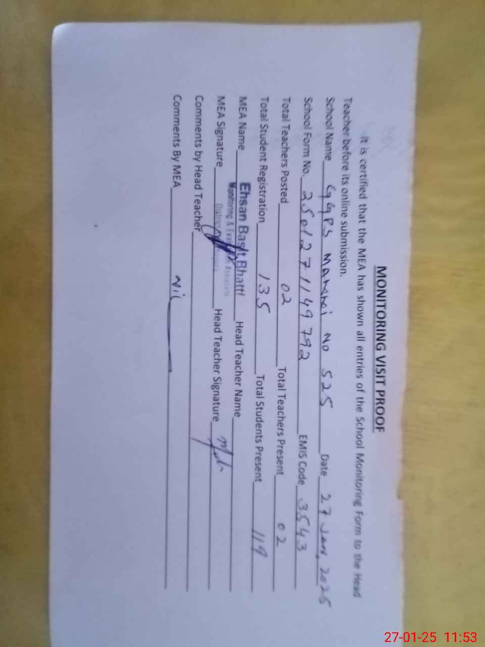 | Attendance Register | Head Teacher | MEA with School | Visit Proof |